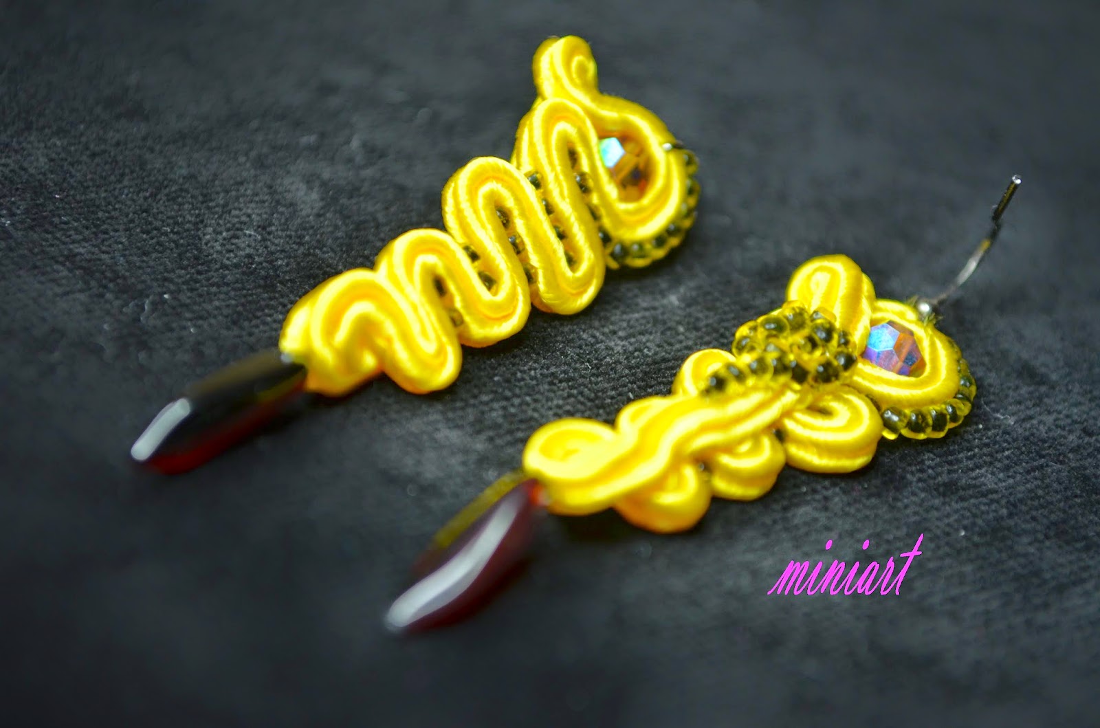 Układ ten sam tyl, że tym razem dominuje żółty. Bardzo delikatne i małe, choć długie kolczyki za kończone podłużnym koralikiem w odcieniach czerni i czerwieni.